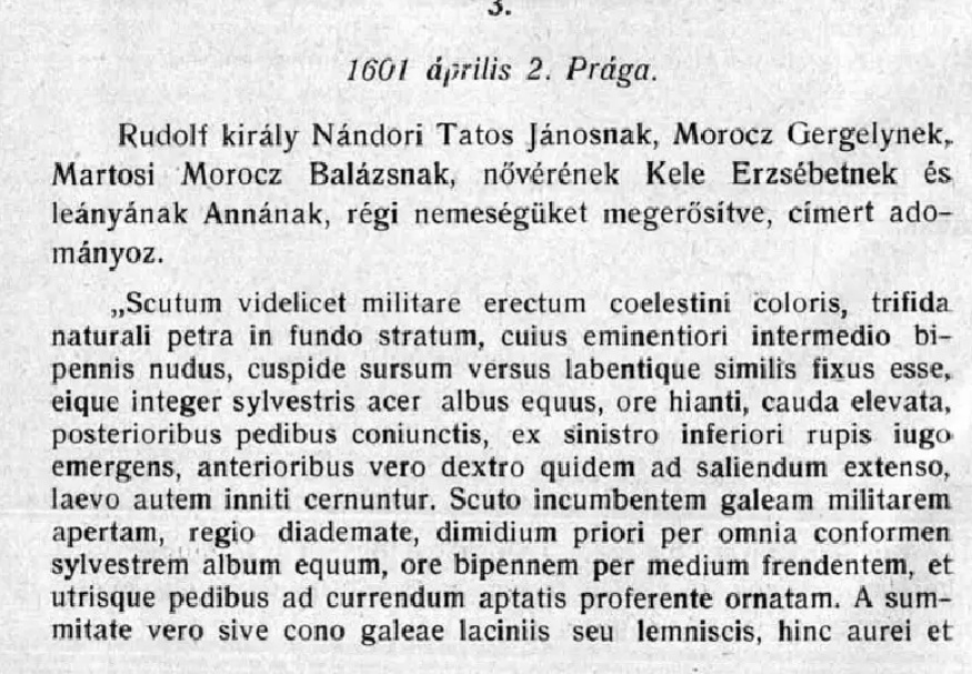 2. apríl 1601, Praha. Kráľ Rudolf udeľuje erb Jánovi Tatosovi z Nándoru, Gregorovi Móroczovi, Blažejovi Móroczovi z Martoviec, jeho sestre Alžbete Kele a jeho dcére Anne, pričom potvrdzuje ich starobylé šľachtictvo.