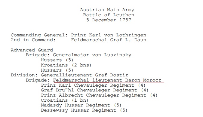 V decembri 1757, v jednej z najväčších bitiek sedemročnej vojny pri Leuthene, zastával barón Imrich Mórocz kľúčovú veliteľskú pozíciu. Pôsobil v hodnosti poľného podmaršála (Feldmarschal-lieutenant) a velil jazdeckej brigáde v rámci divízie generálporučíka grófa Rostiza. Pod jeho priame velenie spadala elitná zostava ľahkého jazdectva a pechoty, ktorá tvorila súčasť predsunutého predvoja (Advanced Guard). Móroczova brigáda zahŕňala tri pluky chevau-légers (ľahká jazda), jeden prápor Chorvátov a dva husárske pluky, vrátane slávneho husárskeho pluku Nádasdy, čo potvrdzuje jeho povesť špecialistu na manévrový boj a velenie mobilným jednotkám.